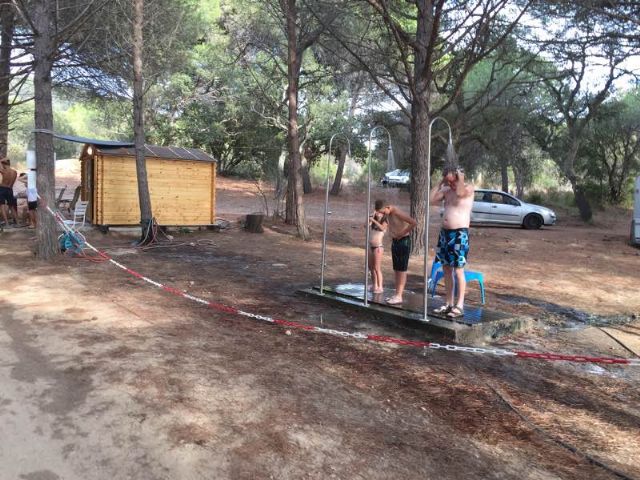 Servizio di carico acqua, doccia fredda, area scarico grigie e nere a pagamento.