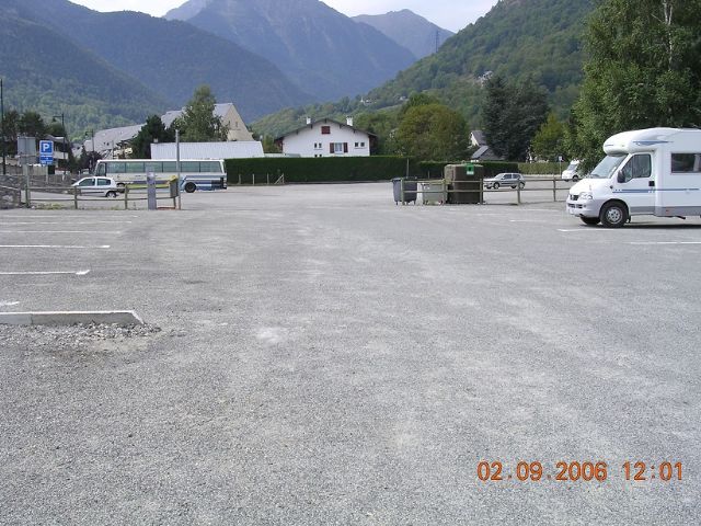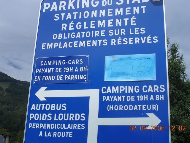 Parcheggio davanti allo stadio, bagni pubblici, due colonnine euroralais e griglia per scarico. acqua 2€ x 100l. , elettricità 2€/1 ora, sosta di giorno gratuita e a pagamento 6€ per la notte.