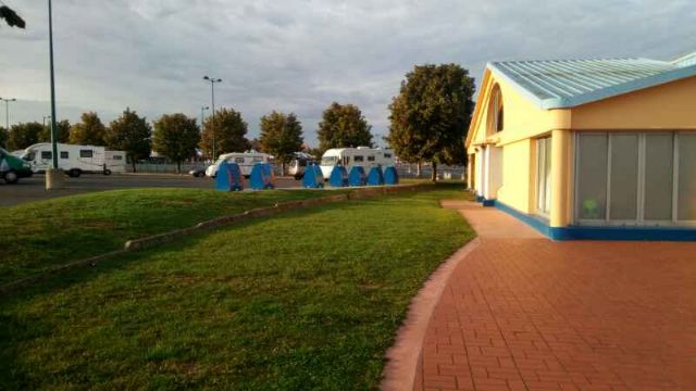 Parcheggio privo di ombra, comodo per il parco divertimento, l'unico accessibile ai camper per entrare al parco. Presenti servizi ma non utilizzati. Troppo caro per solo la sosta. Presenti molti camper quindi sicuro...