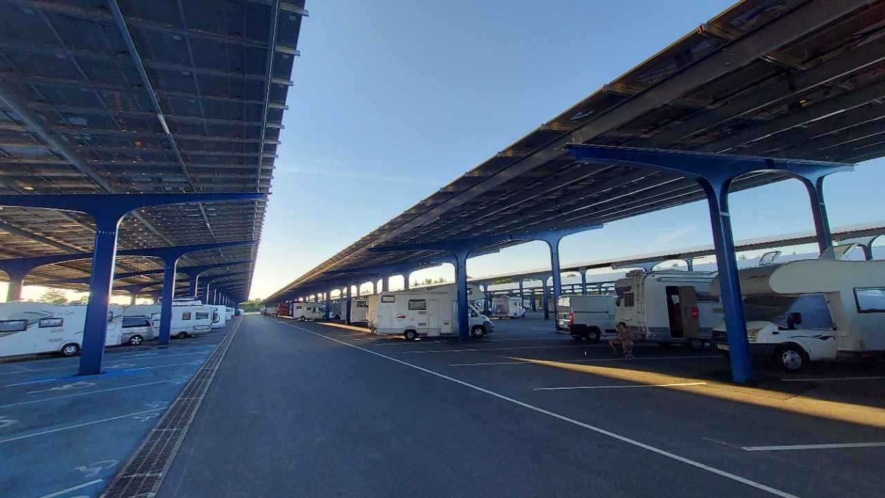 È stata realizzata una mega struttura con pannelli solari che tiene in ombra tutti i camper. Lo scarico camper si trova poco più avanti dell'area, nella zona bus. È possibile raggiungerla in qualsiasi momento una volta dentro. Il rubinetto del carico acqua é senza filetto... bisogna ingegnarsi, invece lo scarico è ok sia per nautico sia per cassetta Wc chimico. Nonostante migliaia di pannelli solari niente paline di corrente ?!