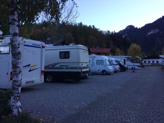 CamperStop presso camping CamperPark Oberammergau. All'ingresso del campeggio, una decina di posti su ghiaia. Camper service con acqua e scarico, a pagamento.