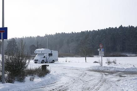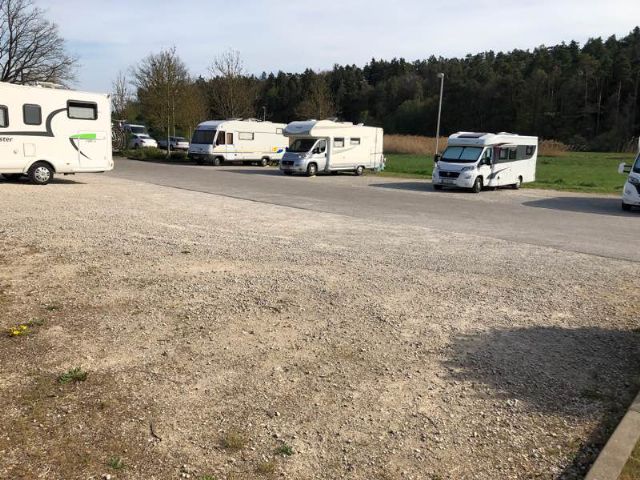 Area sosta da 12 posti in leggera pendenza, su ghiaia senza ombra.