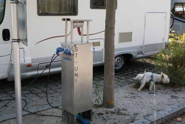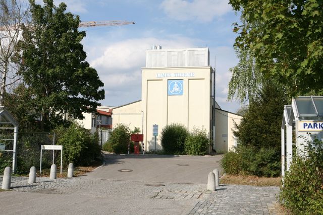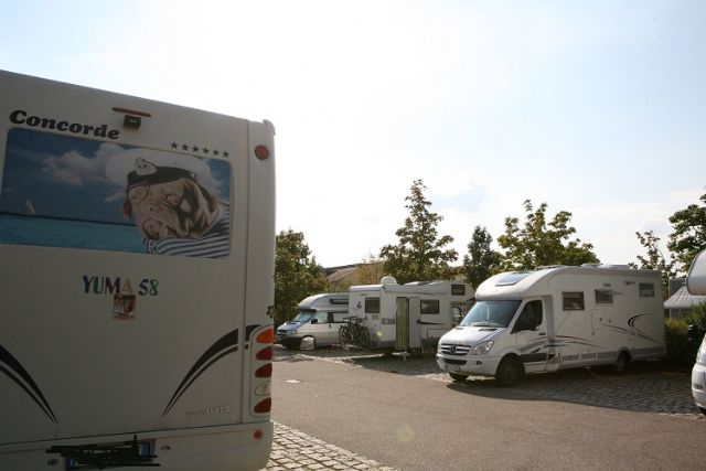 Area camper vicino a Limes-Therme, piazzole ampie e spaziose, asfaltate e su erba, poco ombreggiate.