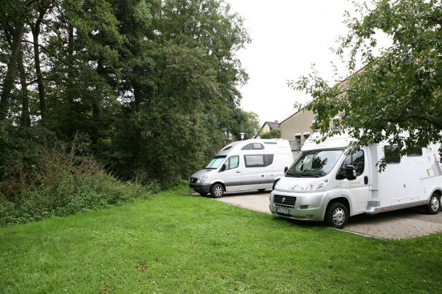 Punto sosta senza servizi per 4 veicoli, in piano su ghiaia, con ombra.
