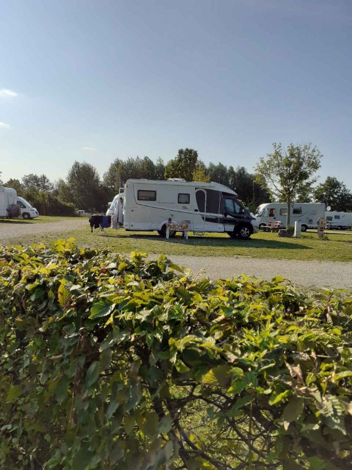 Vicino al campeggio, lungo il Reno, area in piano con circa 50 posti camper (fino 12m lunghezza), sosta max 24h.