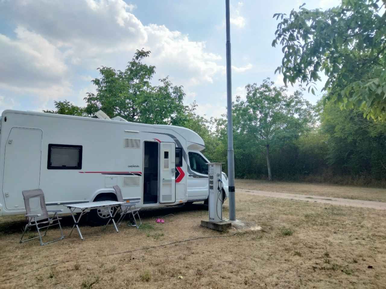 Vicino a campo da tennis e a poca distanza da laghetto e bosco, area camper su prato con circa 40 posti, non ombreggiata, allaccio elettrico, carico acqua e svuotamento grigie e WC chimico, servizi igienici e docce.