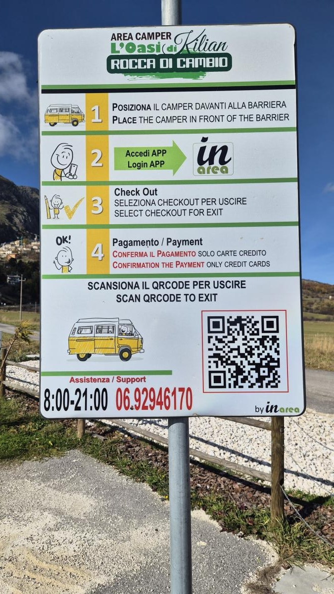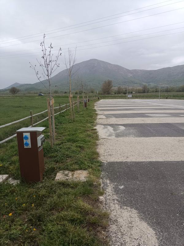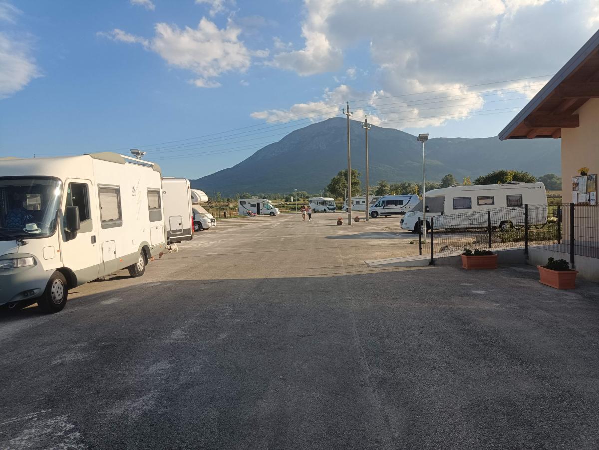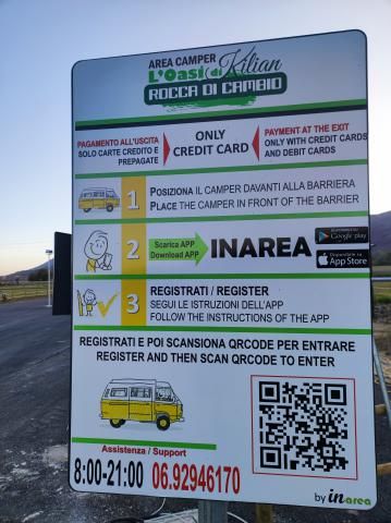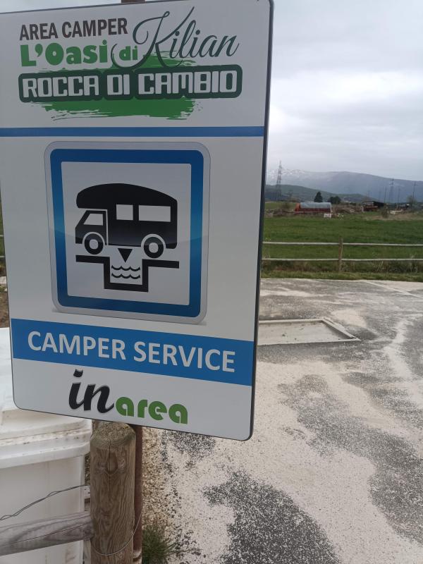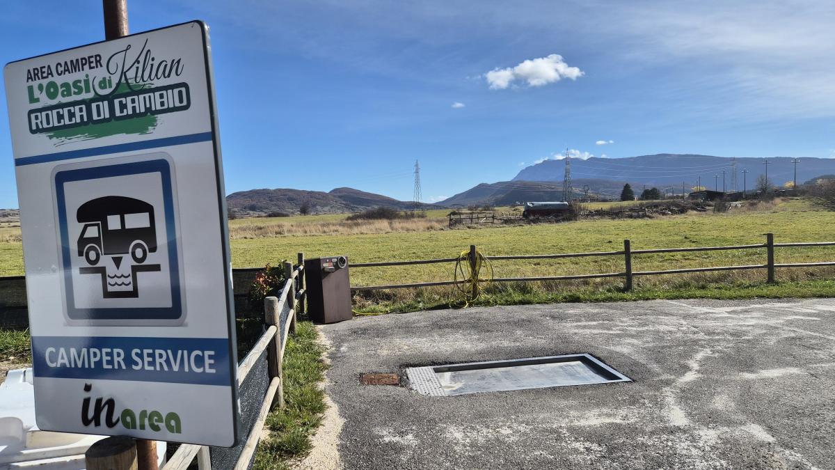 A circa 1 km dal paese di Rocca di Cambio e a 3 km dagli impianti di sci di Campo Felice, area sosta recintata con accesso automatizzato, video sorvegliata (ancora da ultimare) con 28 piazzole su asfalto, allacciamento elettrico 6A, camper service, area picnic/relax, barbecue, area cani.