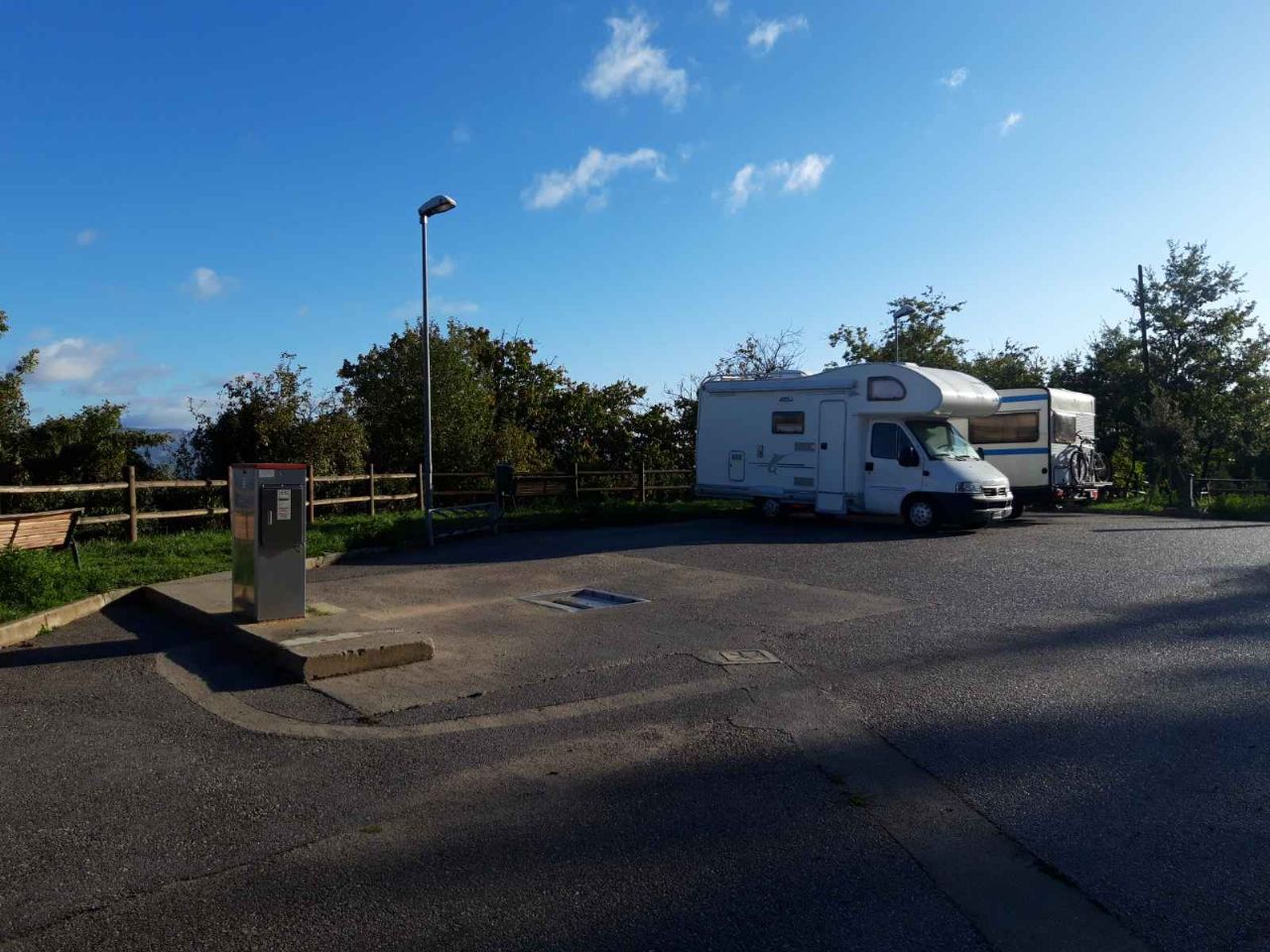 AA comunale con 4 posti, illuminata, CS, carico acqua, allaccio 220V, colonnina antincendio, panchine e tavoli picnic, bacheca informativa, rastrelliere parcheggio biciclette, raccolta rifiuti differenziata