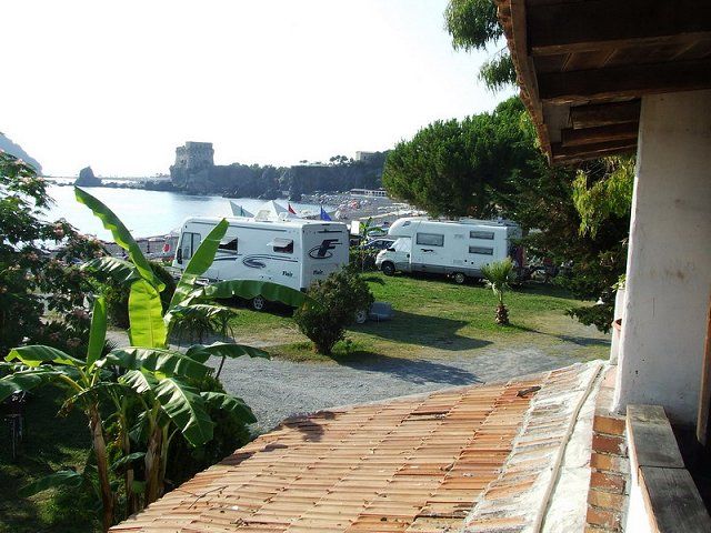 Vicina al centro e alla ferrovia, area attrezzata sul lungomare di Praia, con vista sull'isola di Dino, parzialmente alberata, sul mare (spiaggia di sabbia nera) con 30 posti su prato.