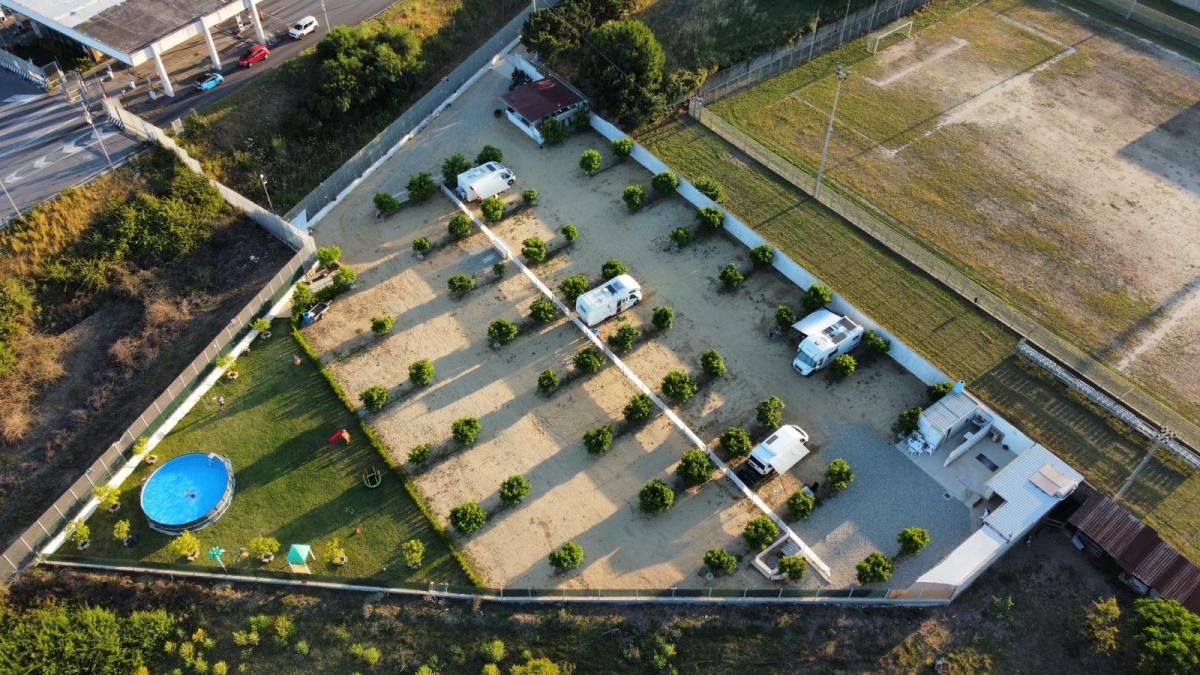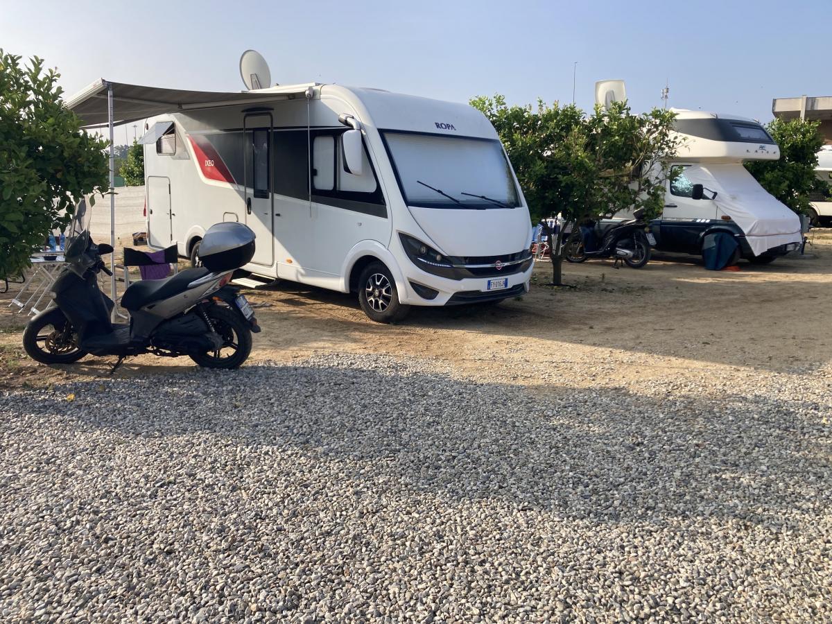 A 750 m dal centro, area attrezzata e parcheggio custodito per camper e caravan, illuminata, recintata e videosorvegliata, con circa 28 ampie piazzole immerse in un limoneto servite da colonnine per allaccio elettrico e fontanella acqua potabile.