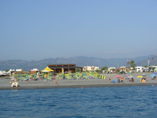 Siamo arrivati nel primo pomeriggio, all'entrata ci ha accolti un ragazzo chiamando subito Francesco che si è presentato come "zio Tom". Mostrandoci la piazzola ci ha chiesto quanti giorni ci fermavamo e se volevamo eventualmente la piazzola" TOP" ci costava qualche € in più, non capivo il motivo, forse perchè fronte mare, spazio per cinque/sei camper recintato da paletti di legno? Ci ha chiesto se avevamo il clima, da nostra conferma ci mostra la colonnina chiusa a chiave e indica la presa da 16 A, con supplemento di € 3, mi dice di chiuderla dopo avere collegato il cavo per la corrente, va bene! Ci siamo fermati per una notte ed è sufficiente per quello che offre, servizi igienici dentro costruzioni di lamiera ed all'interno un caldo asfissiante, poche docce calde e fredde a pagamento a disposizione per i tanti ospiti, pochi lavandini, noi tutto quello che riguarda l'igiene, in camper. Spiaggia affollata per il periodo, molti Campani presumo per la vicinanza a Scalea e per il mare molto bello