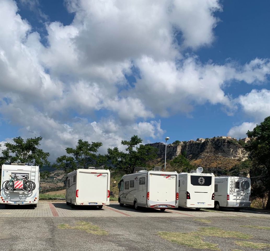 Ampio parcheggio in mezzo a montagna e mare ai piedi della città millenaria di Gerace, pianeggiante vicinissima al centro storico, con scarico (botola prima della salita), carico acqua, allaccio elettrico.