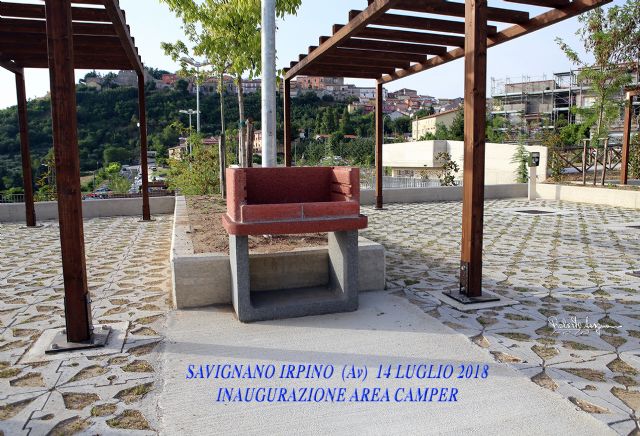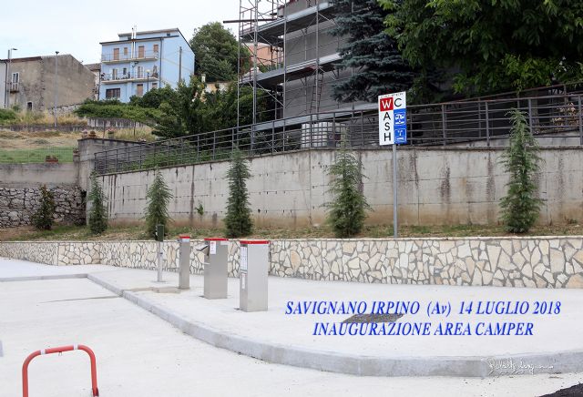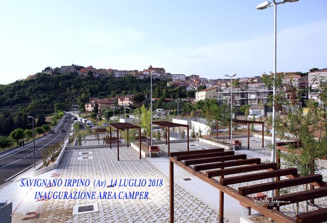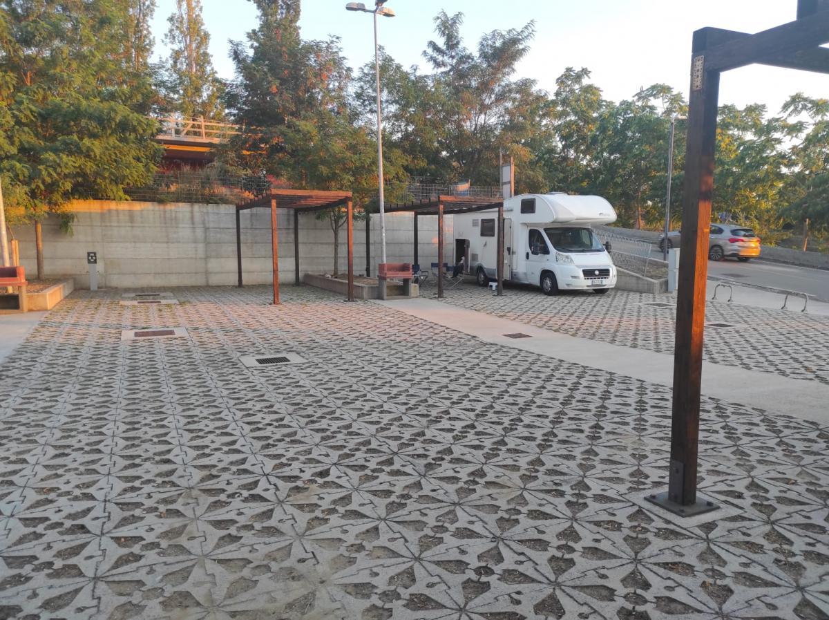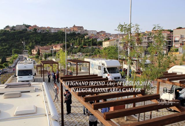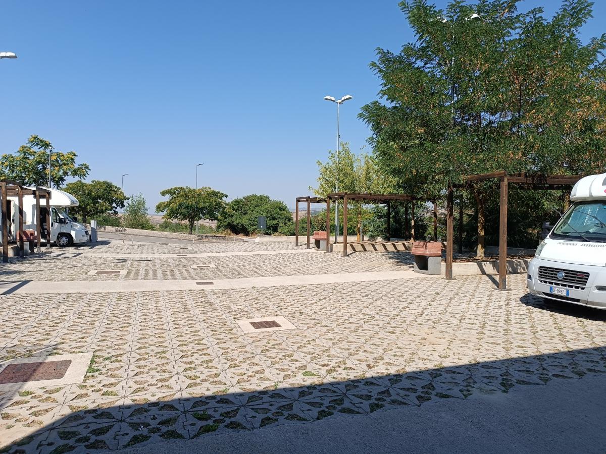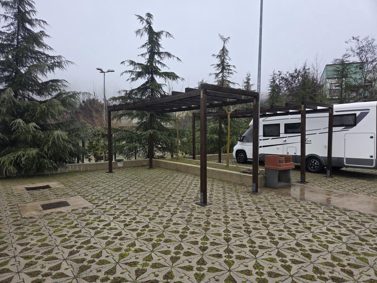 Area camper attrezzata, pavimentata, ombreggiata con ingresso controllato, 12 stalli camper, ognuno dotato di appositi allacci per acqua ed elettricità.