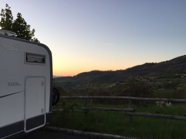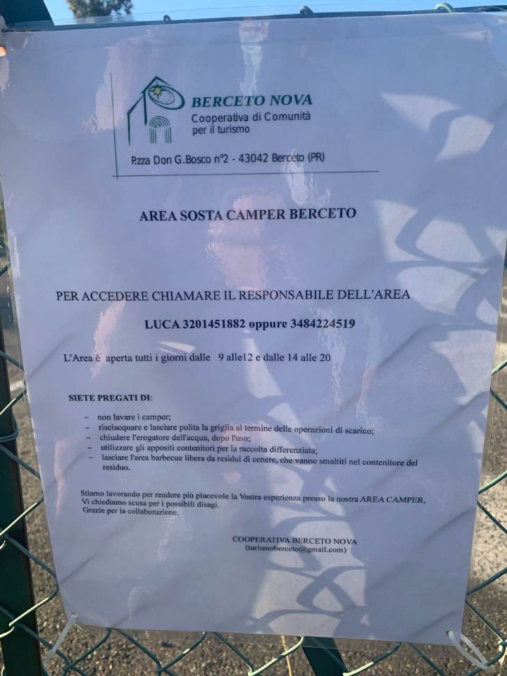 Dispone di circa 20 posti, attacco luce, recintata, illuminata, blocco WC, carico e pozzetto scarico, zona barbecue,