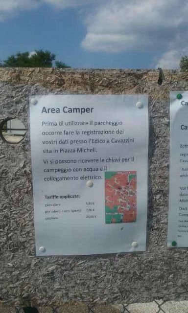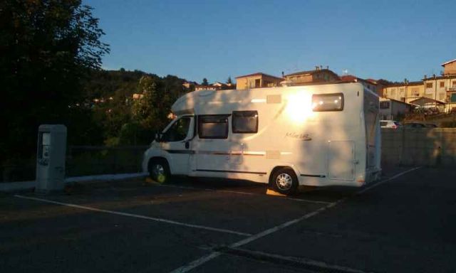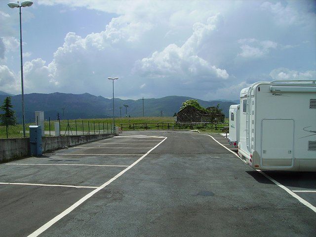 Area attrezzata recintata, segnalata, a circa 200 m dal centro, a pagamento, ingresso con sbarra automatica per la chiave chiedere/telefonare all'edicola (i numeri di telefono sono segnalati all'ingresso).