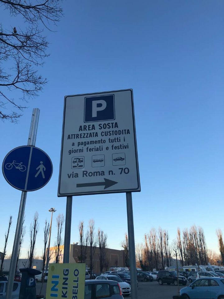 Visitata 17/10/2019. Parcheggio custodito su sterrato, senza spaziatura tra un veicolo e l'altro, ti devi mettere five dicono loro, e se non hai il cavo lungo almeno 25 mt. e sei distante dalla colonnina niente corrente. Prezzo euro 10 a notte. Scarico grigie e nere tutto insieme in un pozzetto piccolo che viene aperto solamente dal personale al costo di 2 euro. Niente scarico il sabato causa presenza di mezzi parcheggiati per il locale mercato. A circa 1,5 km. c'è il centro storico. Vicinissimo al parco e alla pista ciclabile. Non ci sono bagni. Vicino alla stazione Treni. Adiacente all'omonimo cinema Settebello.