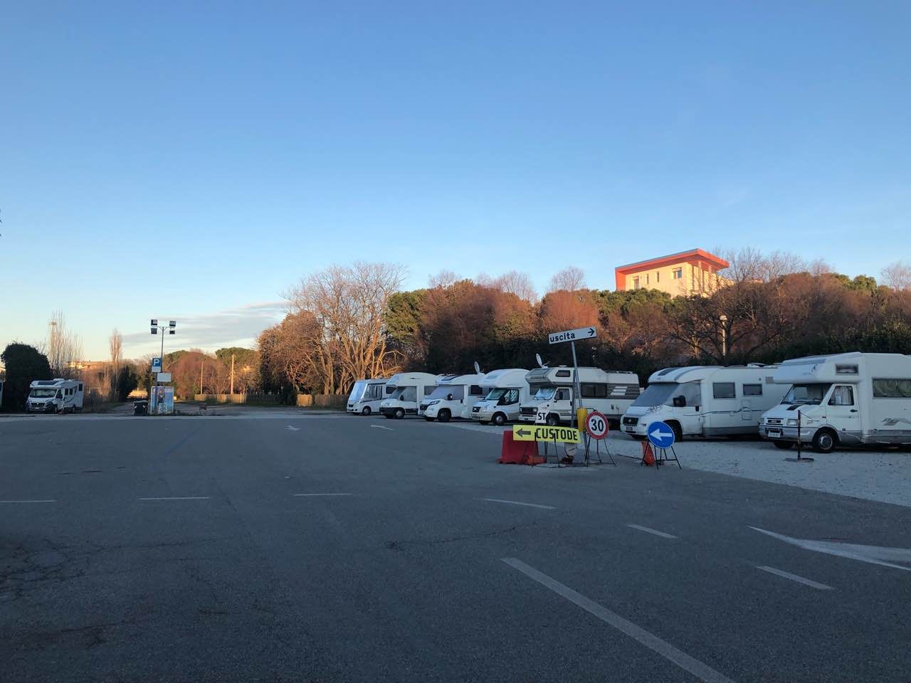 A metà strada tra il mare ed il centro città, a ridosso di una bella ciclabile che collega i suddetti punti. Il contesto non è granché trattandosi di un grosso parcheggio riservato in parte ai camper, però consigliabile anche perché custodito h24. 20 euro per 24h con allaccio.