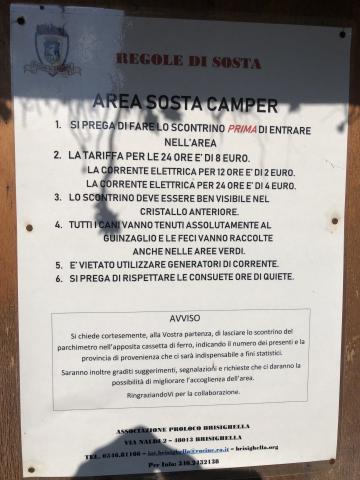Sosta camper ok. Peccato per il malfunzionamento della corrente elettrica: abbiamo pagato 9 euro per 18 ore (50 cent. all'ora), ma dopo 2 ore non funzionava più e abbiamo dovuto pagare nuovamente... Unico contatto telefonico la Pro Loco, che però ha un numero fisso... quindi non sempre reperibile per problemi o informazioni.