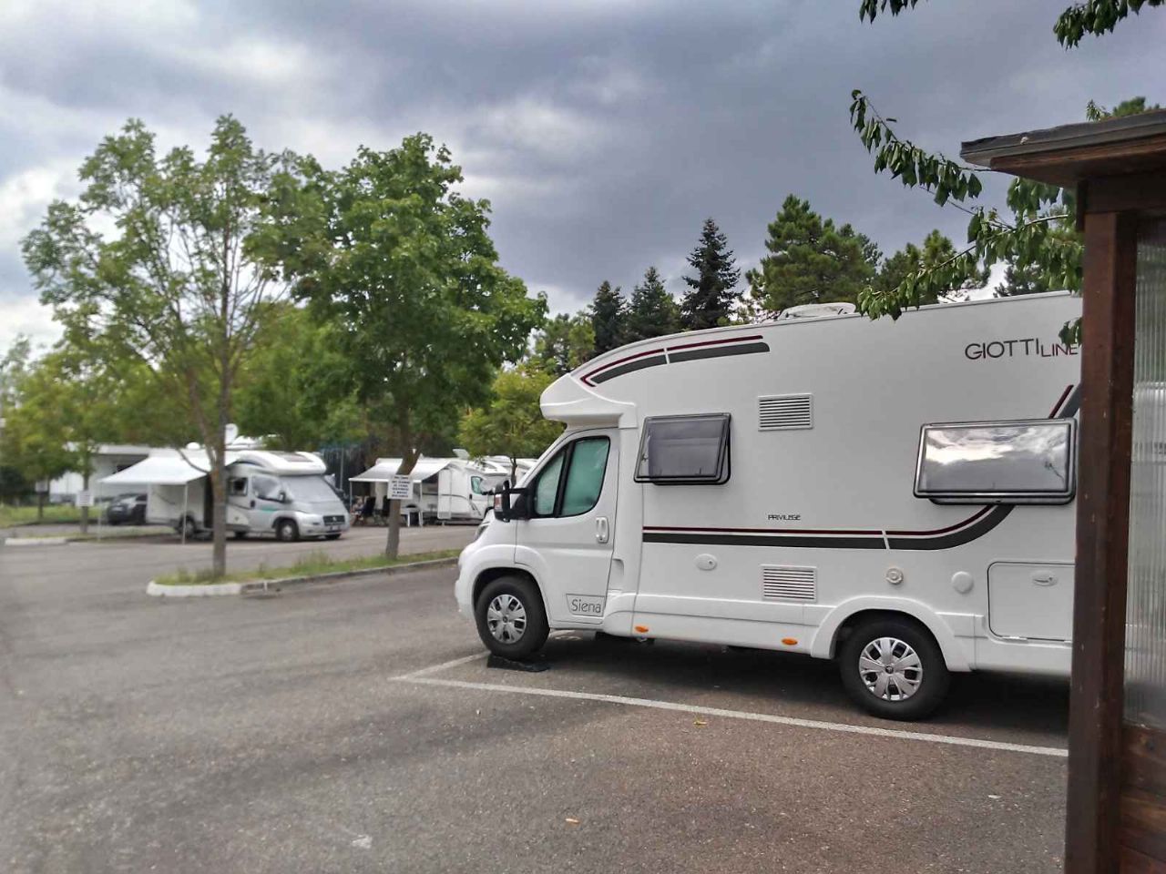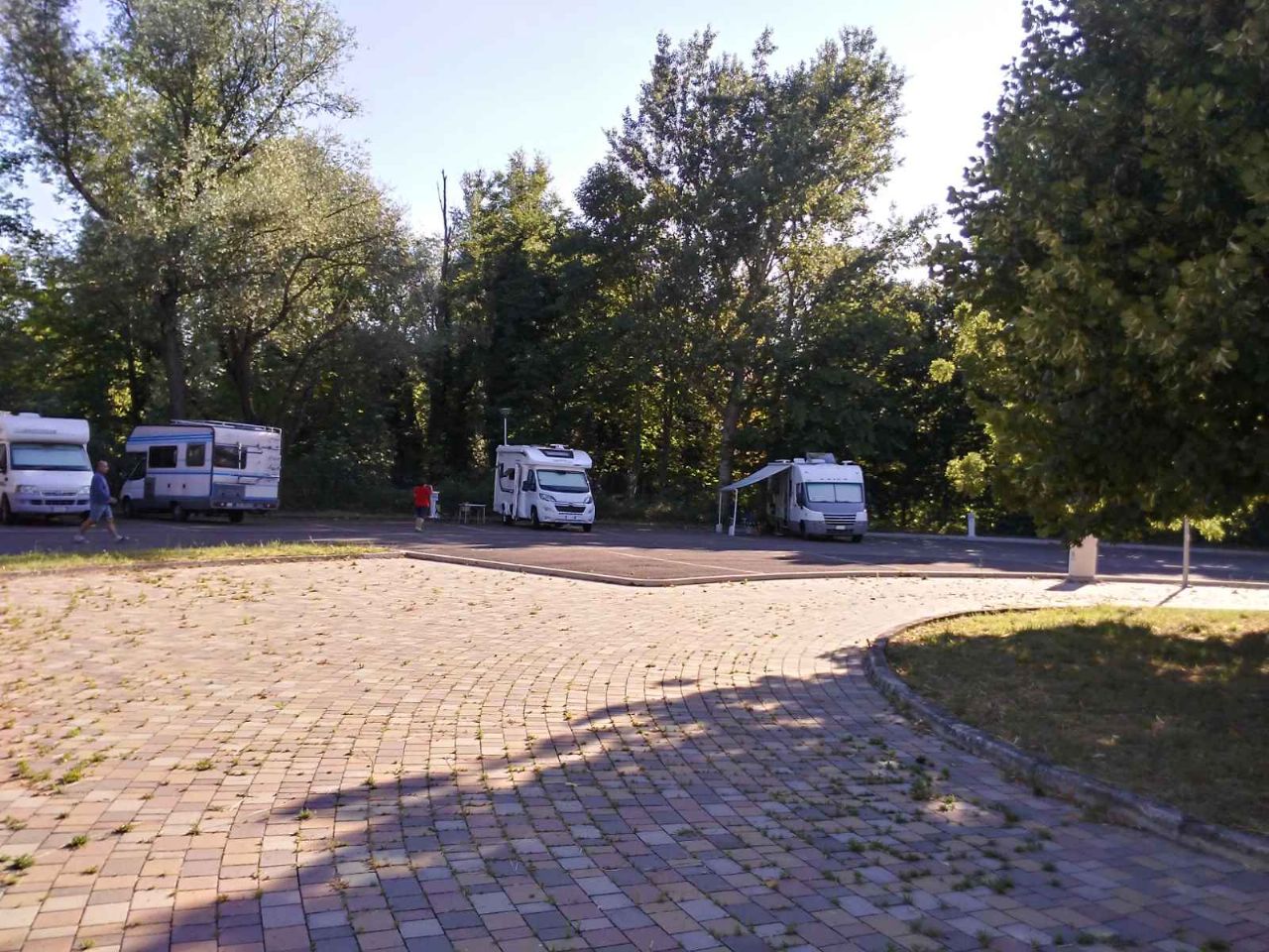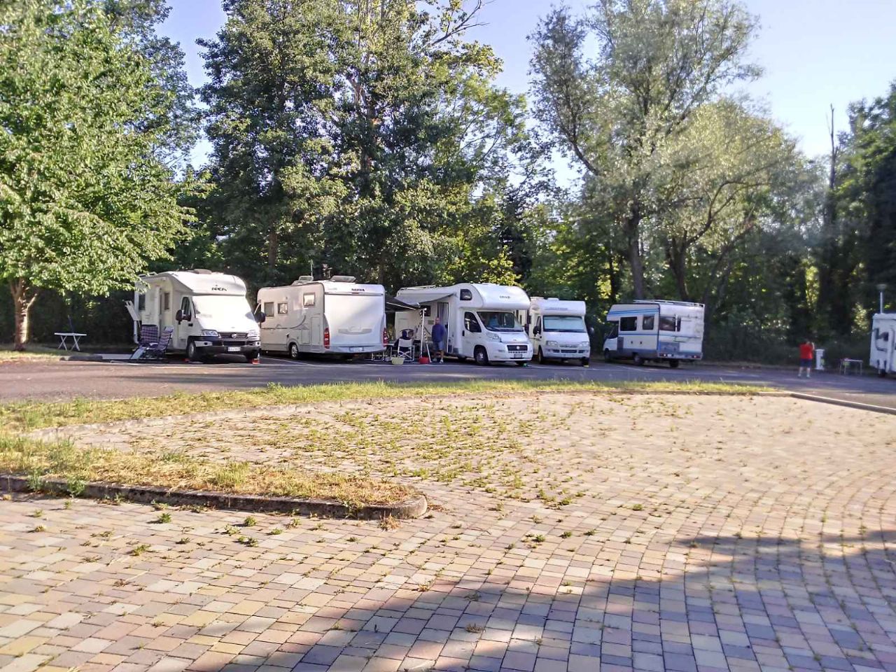 Il parcheggio può contenere fino a 50 camper, dalla foto si notano anche le altre 2 zone adiacenti, che possono dare sosta ad altri camper, questo soprattutto durante le manifestazioni fieristiche.