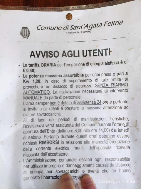 Confermiamo che durante la fiera e il mercatino, il costo è di 15 euro. Pochissime piazzole sono in piano, quindi servono i cunei, però ora è tutto su stabilizzato o asfalto. Corrente a pagamento: 0,40 euro, massimo 1200W. Scarico grigie e nere efficiente. Presente anche la raccolta differenziata.