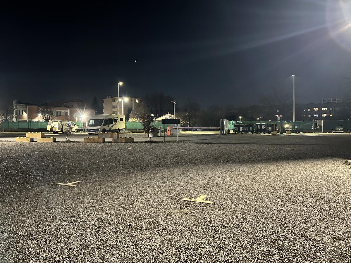 L'area è recintata in zona tranquilla. Il centro non è così vicino. Si può raggiungere con i mezzi (il 30, ma non fa servizio notturno) in mezz'ora (fermata davanti area di sosta) o con la bici in poco meno, ma è un tratto non proprio tranquillo. Ha l'energia elettrica ed è illuminato. C'è anche un utilissimo negozio di accessori per camper