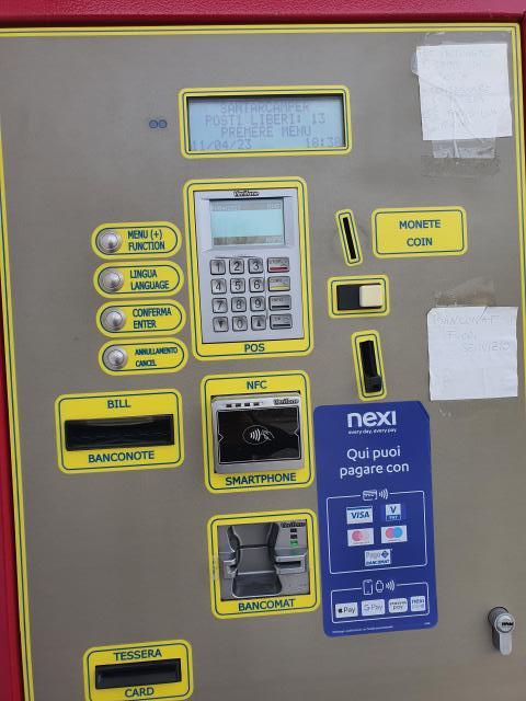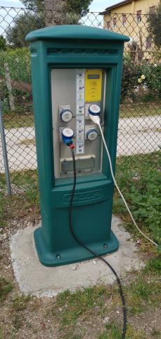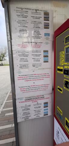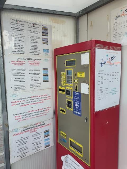 Ora si può pagare anche con bancomat. Prima di pagare l'allaccio elettrico meglio verificare se ci sono residui lasciati dai precedenti camperesti: è sufficiente premere il pulsante a lato della presa e sul display compare eventuale credito. Io ho trovato 9 ore!