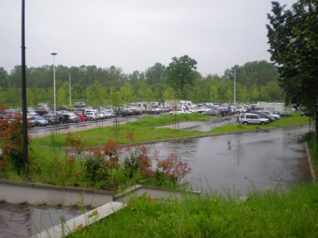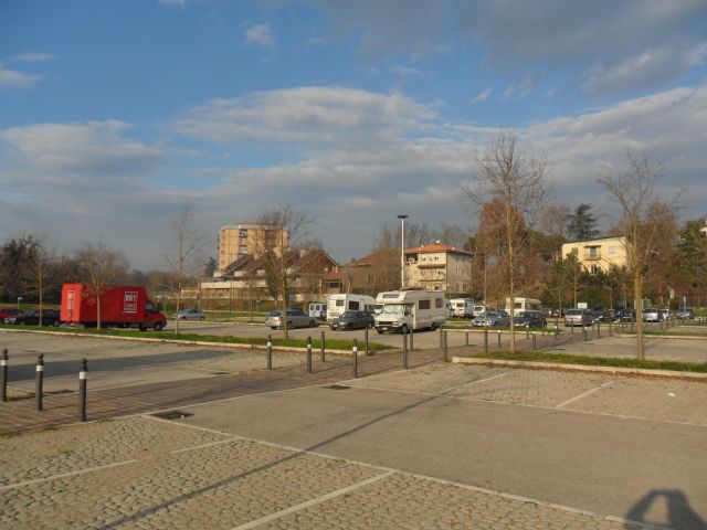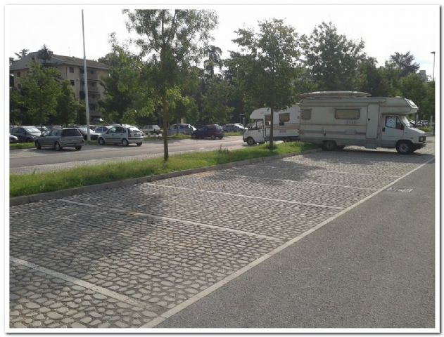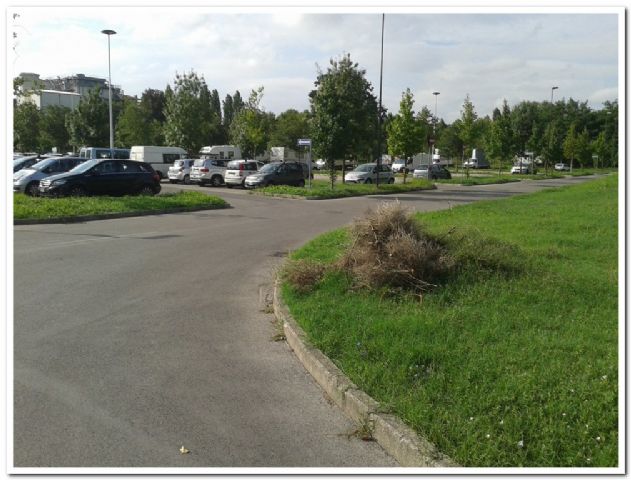 Area sosta gratuita in un parcheggio misto auto, dove gli stalli per i camper sono troppo corti, per cui con i camper ci si mette in altre posizioni.