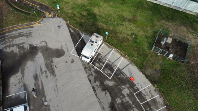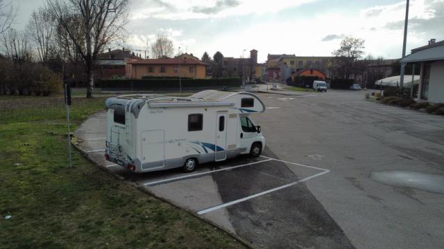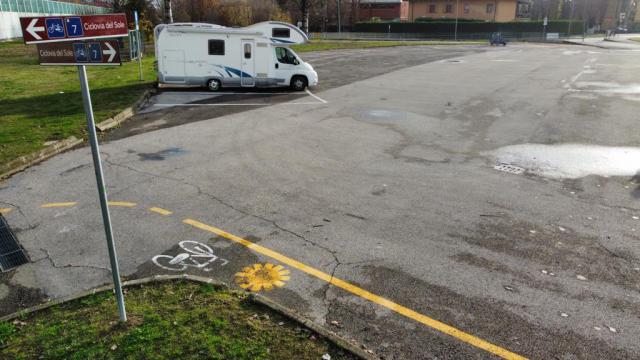 Adiacente al tracciato della Ciclovia del Sole (EV7, tratto Bologna-Mirandola), a 300 metri dal Centro Storico, punto sosta gratuito su asfalto, in piano, illuminato, priva di limitazioni. Nessun servizio camper.