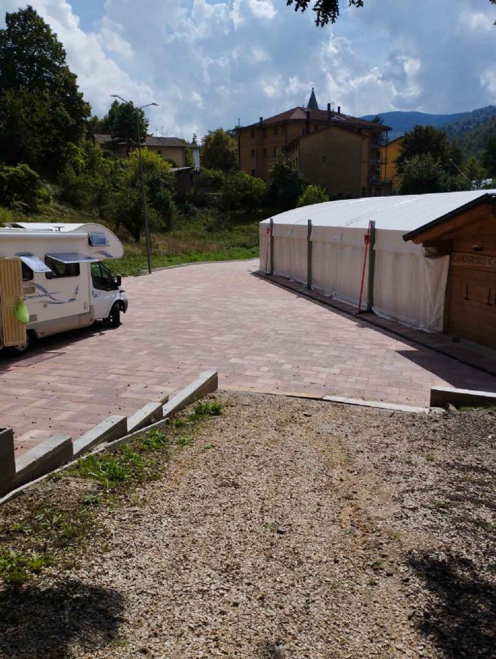 Nel parking in riva al laghetto in loc. Castel dell'Alpi, segnalato, su brecciolino, illuminato, gratuito, con barbecue. Provenendo da San Benedetto Val di Sambro l'area si trova 50 metri dopo il ponte a sinistra, pozzetto di scarico.