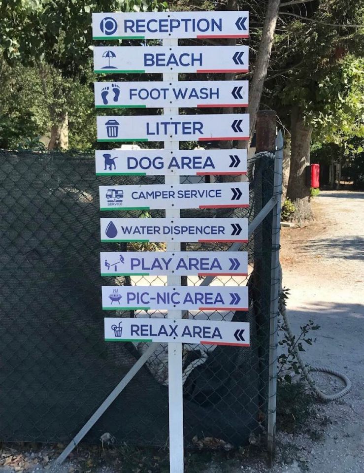 Blocco sanitario con WC e docce calde/fredde, camper service, Wi-Fi, zona lavaggio panni e stoviglie, distributori automatici bevande, punto ristoro/bar.