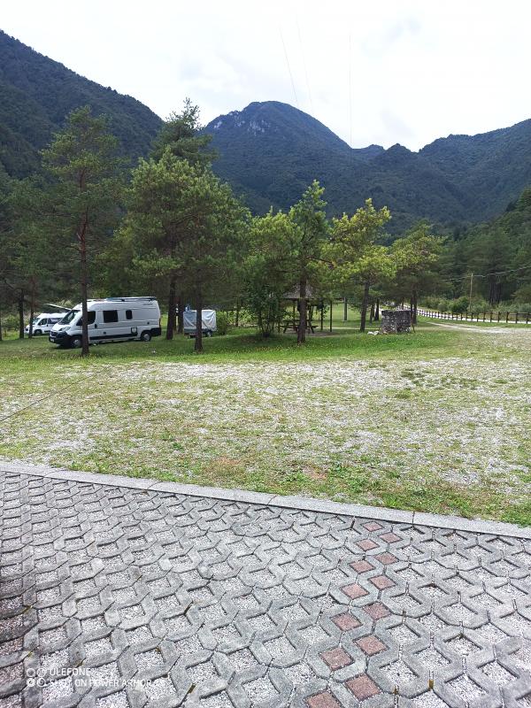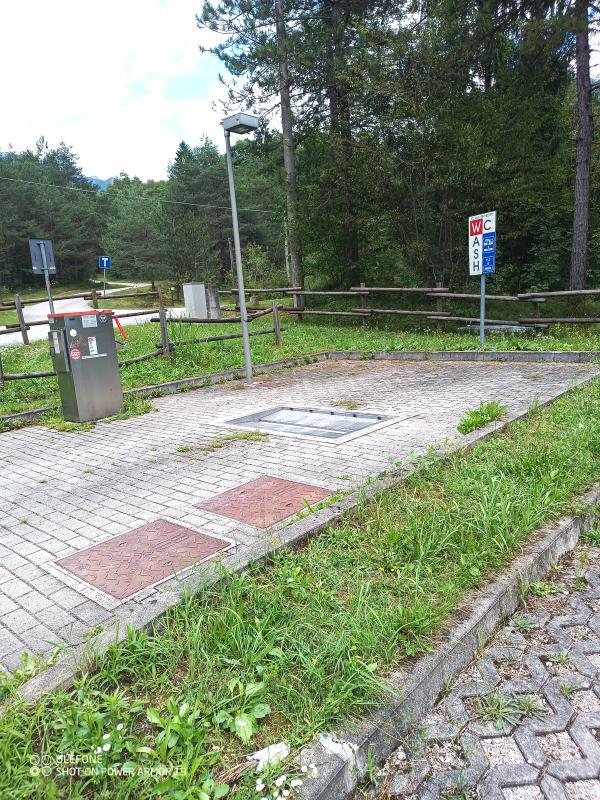 Area parzialmente ombreggiata, a pagamento (riscossione da addetto comunale) con 4 stalli, sulla riva di un torrente balneabile, carico/scarico WC-Wash, allacciamento elettrico.