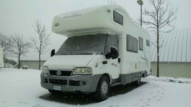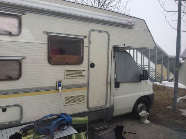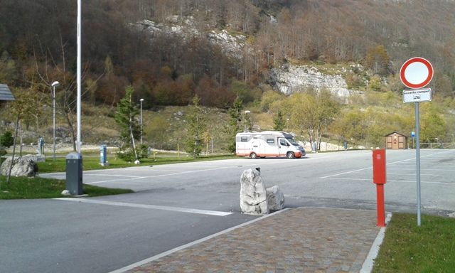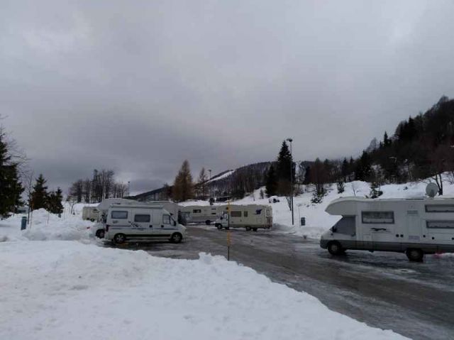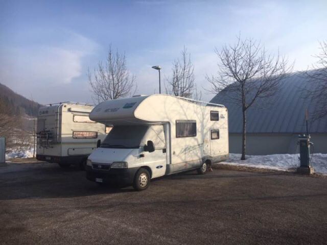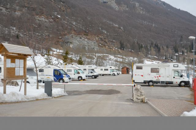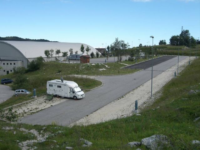 Area pianeggiante, custodita, con sfondo asfaltato, 70 posti, non ombreggiata, CS gratuito, allacciamento elettrico.