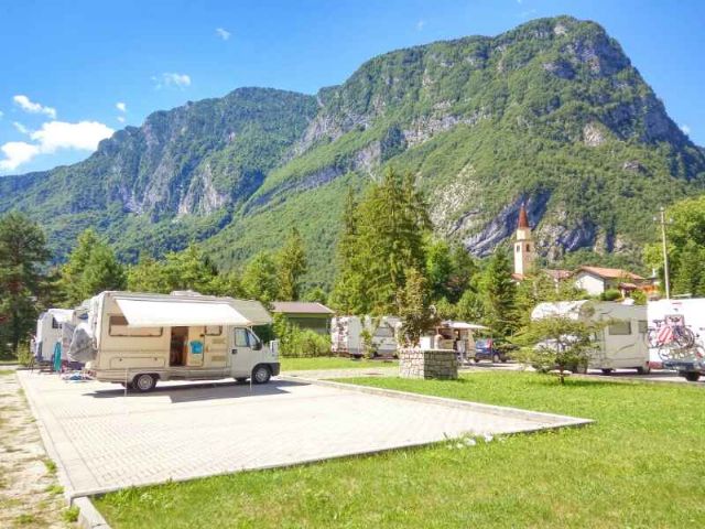 Area attrezzata riqualificata di recente. 8 piazzole centrali su autobloccanti enormi + altre 6 laterali lunghe 9 m, tutte però al sole. Aperta dal 1 Aprile, 15€/24h, bancomat, cc o monete (alla data odierna il sensore di prossimità del lettore bancomat non funziona bene quindi bisogna bisogna inserire la carta sul lettore). Se tutti i posti fossero occupati comunque all'esterno, lungo il torrente c'è parecchio, spazio per ripiego in libera. A 1 minuto dal centro, paese carino ma con pochi servizi. Area picnic con parco giochi adiacente e passeggiate rilassanti lungo il torrente Cimoliana. PS: Leggo che a tanti danno fastidio le campane della chiesa vicina. Per me invece è sempre un piacere sentirle.