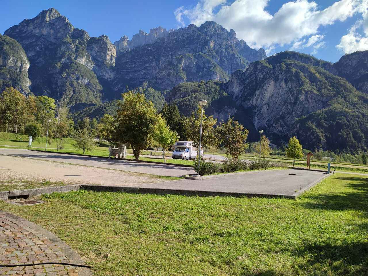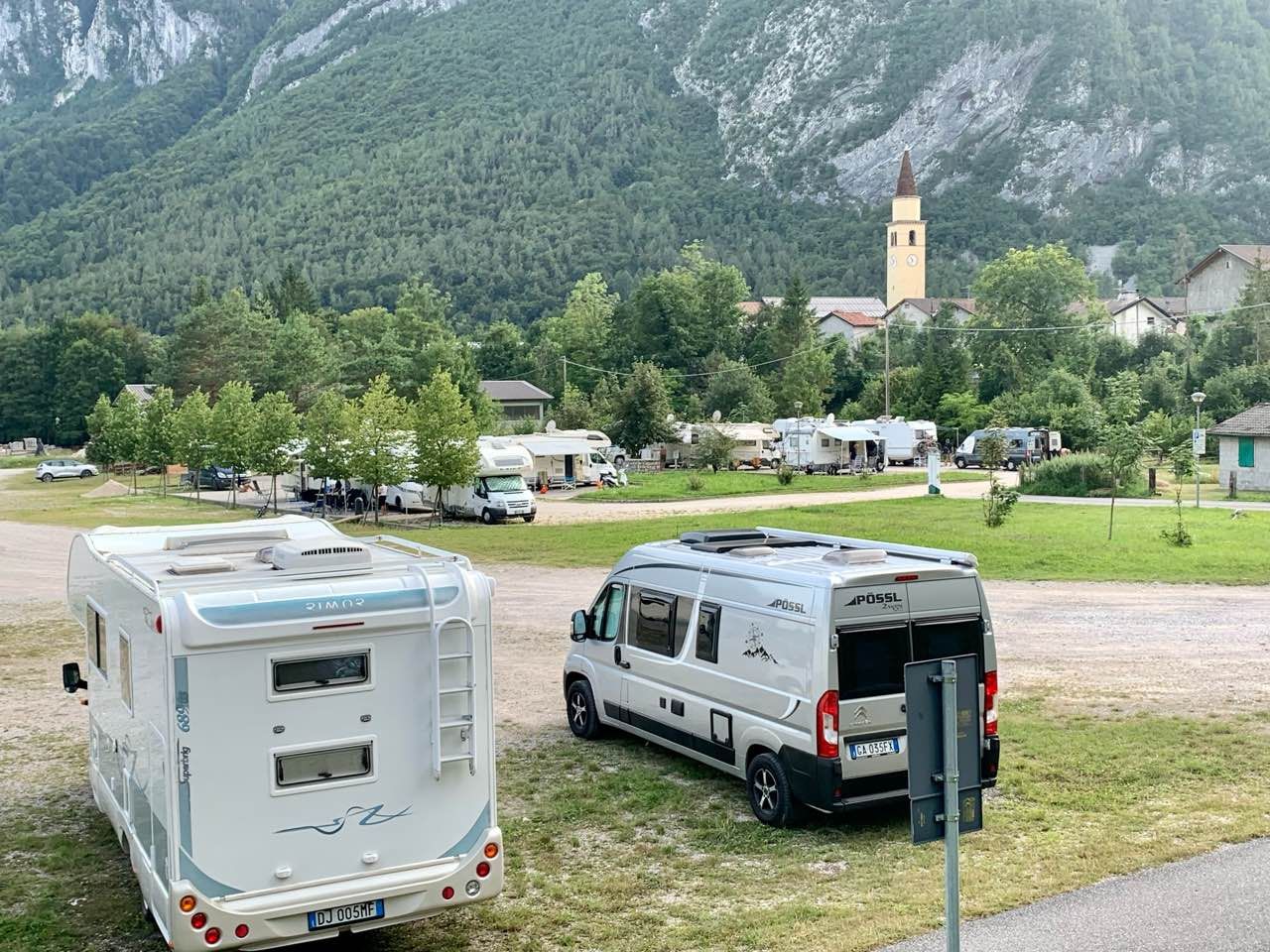Area ottimale per visitare il paese a quota 630 m e accedere alla valle del torrente Cimoliana con la strada (troppo difficile in camper se non si è veterani) che sale fino al Rifugio Pordenone a 1200 m, da cui è possibile raggiungere a piedi il famoso "Campanile". Dieci euro per 24 ore, pagamento con carta non funzionante, solo moneta metallica. Scarico antidiluviano con pozzetto circolare sia per grigie che nere, con bordo rischioso per camper a fondo basso. Piazzole troppo grandi e quindi pochi allacci per la corrente. Rubinetto acque potabili in centro. Poteva essere progettata meglio, ma in zona resta una risorsa. Tollerata la sosta nell'ampio piazzale erboso che precede la viuzza di accesso. Molesto il campanile che suona due volte sia le ore che le mezzore, davvero un segno di inciviltà.