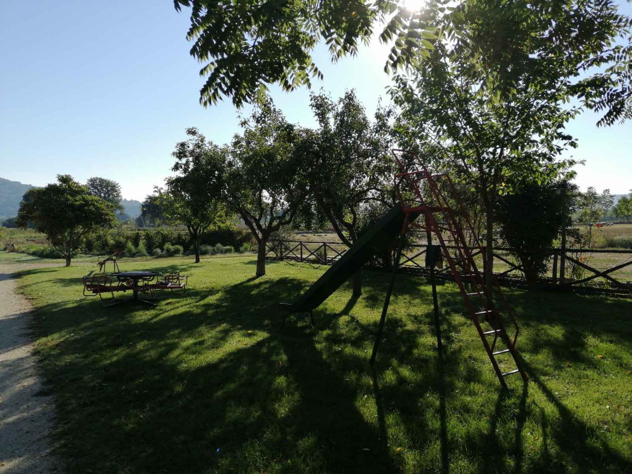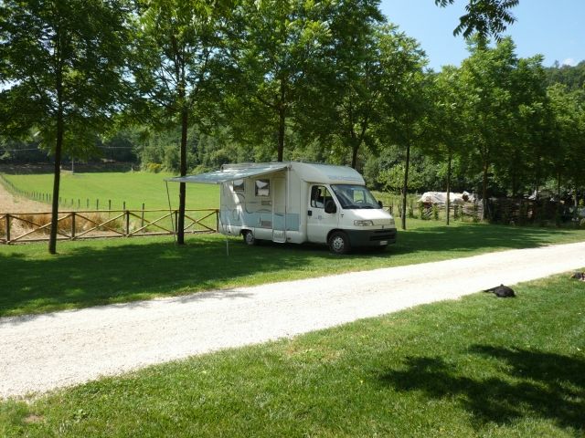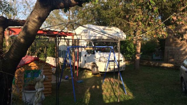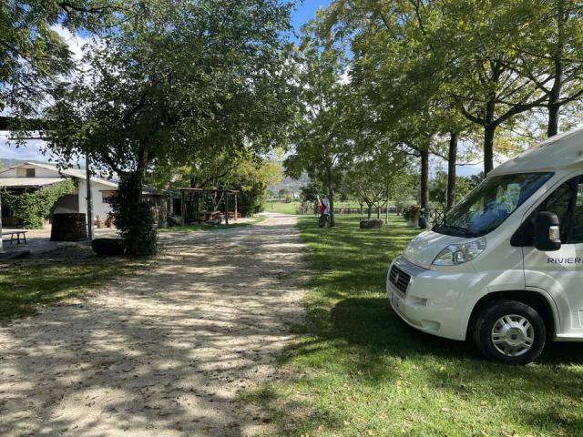 Punto sosta gratuito presso l’agrifattoria con piazzole su prato, allaccio elettrico, carico acqua, lavello stoviglie.