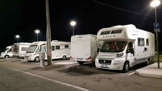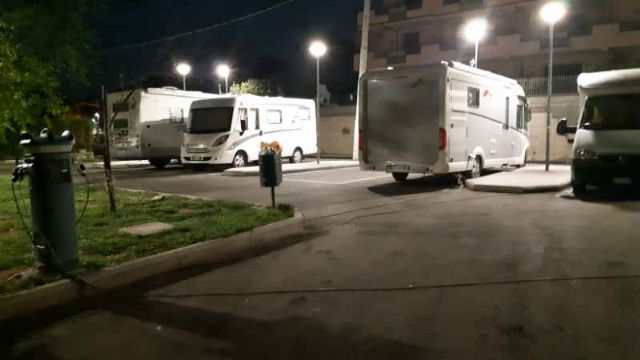 A 500 m dal centro storico, punto sosta video sorvegliato, panoramico, a pagamento con parchimetro a monete, leggermente in pendenza, non ombreggiato, 7 posti delimitati, di cui 6 con allaccio elettrico, fontanella di carico (attacco da 1/2 pollice), scarico a pozzetto acque grigie e nere.