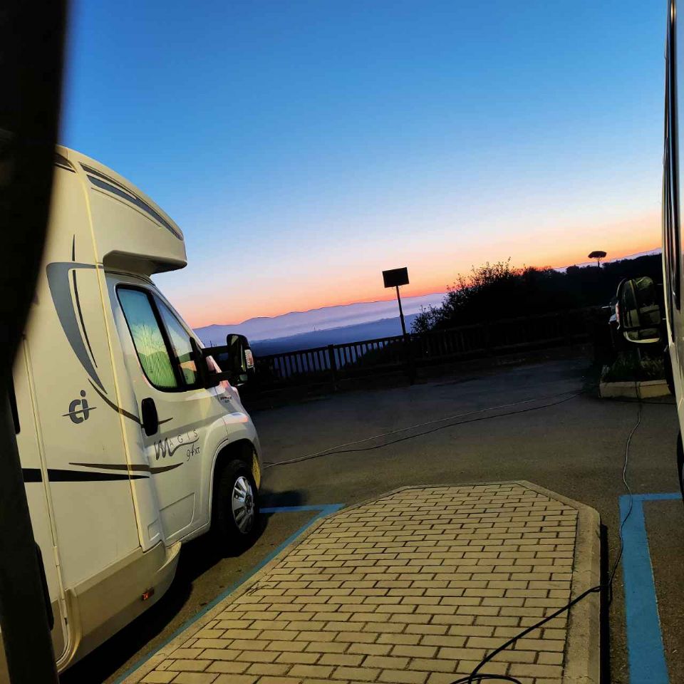 Sicuramente molto attrezzata per luce, carico acqua e scarico grigie. Mancanza scarico nere. Panorama mozzafiato sul belvedere. Purtroppo è impossibile dormire: campane notturne ogni 15 min, macchine in transito in continuazione.