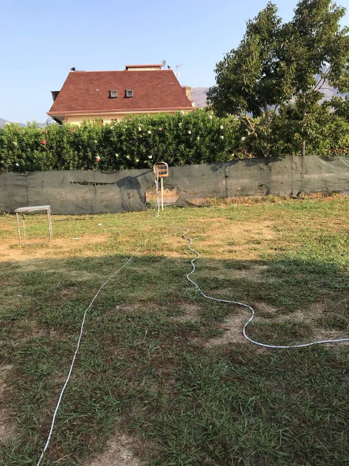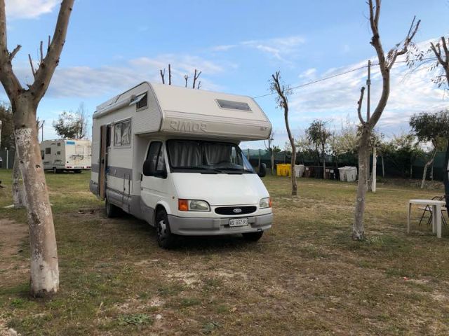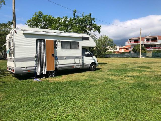 Punto sosta su erba con 45 posti camper, a 300 m dal mare, pianeggiante, parzialmente ombreggiata.