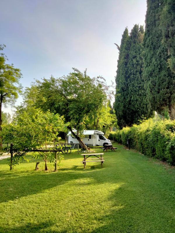 A circa 1 km da Monzambano e adiacente alla ciclabile Mantova-Peschiera del Garda, area sosta presso agriturismo con 8 piazzole su erba, allacciamento elettrico, area BBQ e picnic con tavolini, piscina con lettini prendisole, camper service.