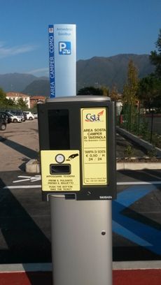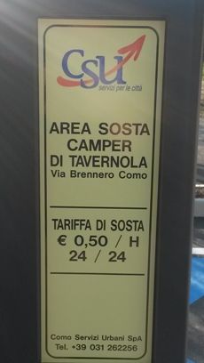 Area con 10 posti spaziosi e ben delimitati. La sosta costa 50 cent ad ora e tutti i servizi sono a pagamento. Carico acqua (1,5 € x 100 litri), elettricità a consumo (1 euro per 1KWh) e camper service (2,50 €). A 10 minuti a piedi c'è la fermata del battello per raggiungere Como in 8 minuti di navigazione.