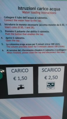 €24/24h o €0,50/h, €1/kW elettricità, €1,5 acqua, €2,5 scarico