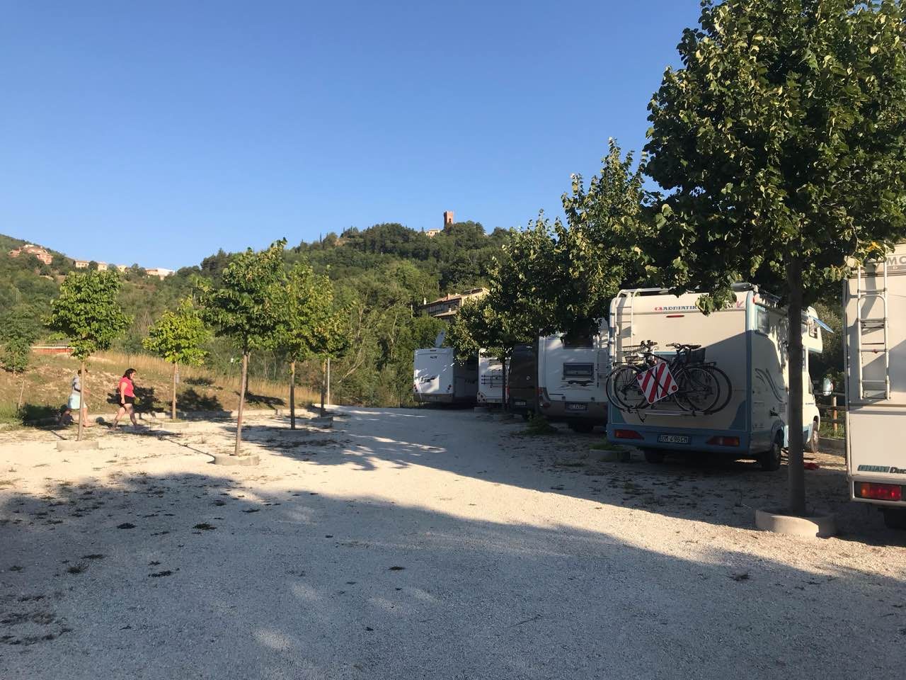 A circa 1,2 km dal centro, adiacente al Parco Avventura Lago di Fiastra, area sosta a pagamento tramite app "in area", con 16 piazzole su ghiaia delimitate da alberi, in piano.