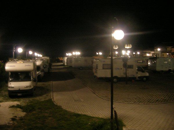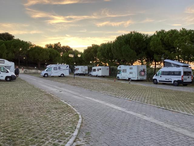Area attrezzata in ottima posizione, proprio sotto l'accesso di Porta Marina. 14€ al giorno senza corrente, 18€ con allaccio elettrico. Si paga al gabbiotto.