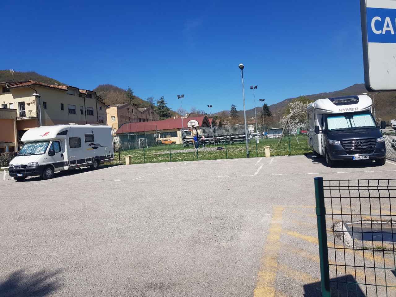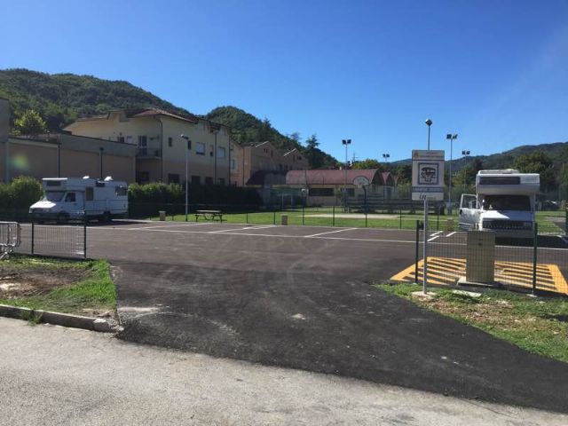 A 200 m dal borgo storico, vicino a centro sportivo, area sosta camper con 6 stalli in asfalto, illuminato, carico/scarico e allaccio elettrico.