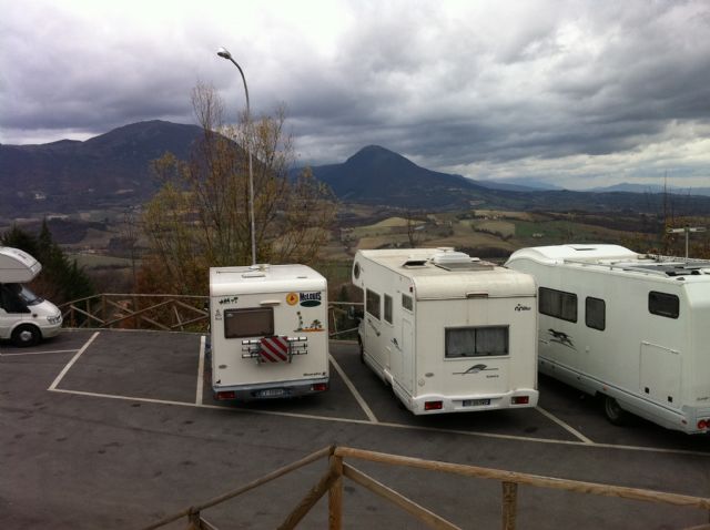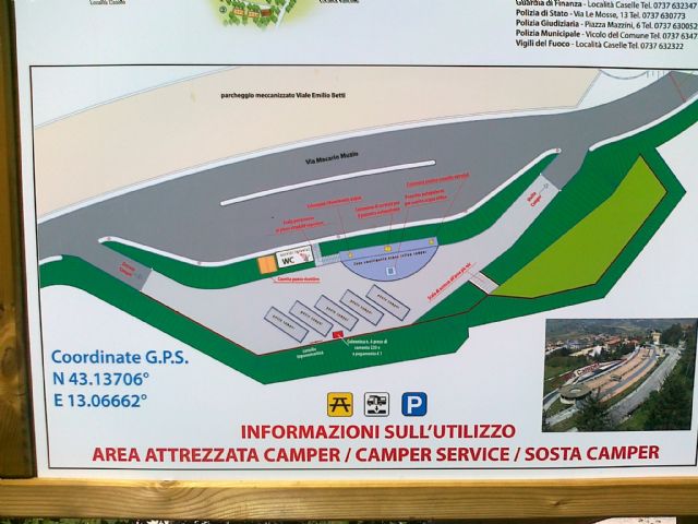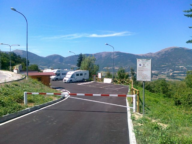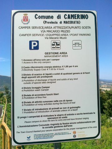 La bellissima area camper di Camerino si sviluppa ai piedi di un paese fantasma, ferito nell'intimo dalla violenza terribile dell'ultima scossa. È tutto perfetto dentro questo ampio piazzale spalancato sulla valle. Tutto, davvero, funziona a dovere. La bella area è anche un invito a visitare questo luogo mortificato, che faticosamente tenta di tornare alla vita. Una sosta particolare nel dolore e nel silenzio, che Camerino generosamente regala alla sensibilità dei suoi ospiti.