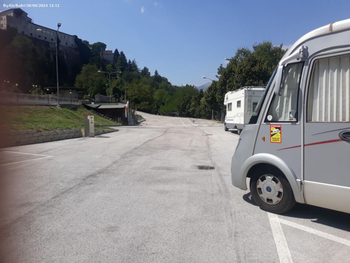 Area sosta ampliata il 5/09/2020, 20 posti, asfaltata, sotto le mura. Carico e scarico acqua, elettricità a pagamento con monete tramite colonnine. Illuminata e gratuita, 2 bagni e docce calde gratis. Fermata bus per il centro. Consigliata.