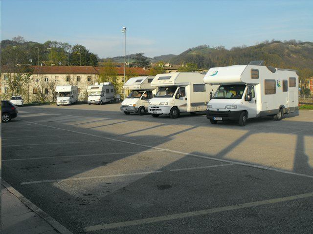 A 300 m dal centro, nel piazzale delle Poste, punto sosta in leggera pendenza, misto auto, presente camper service.