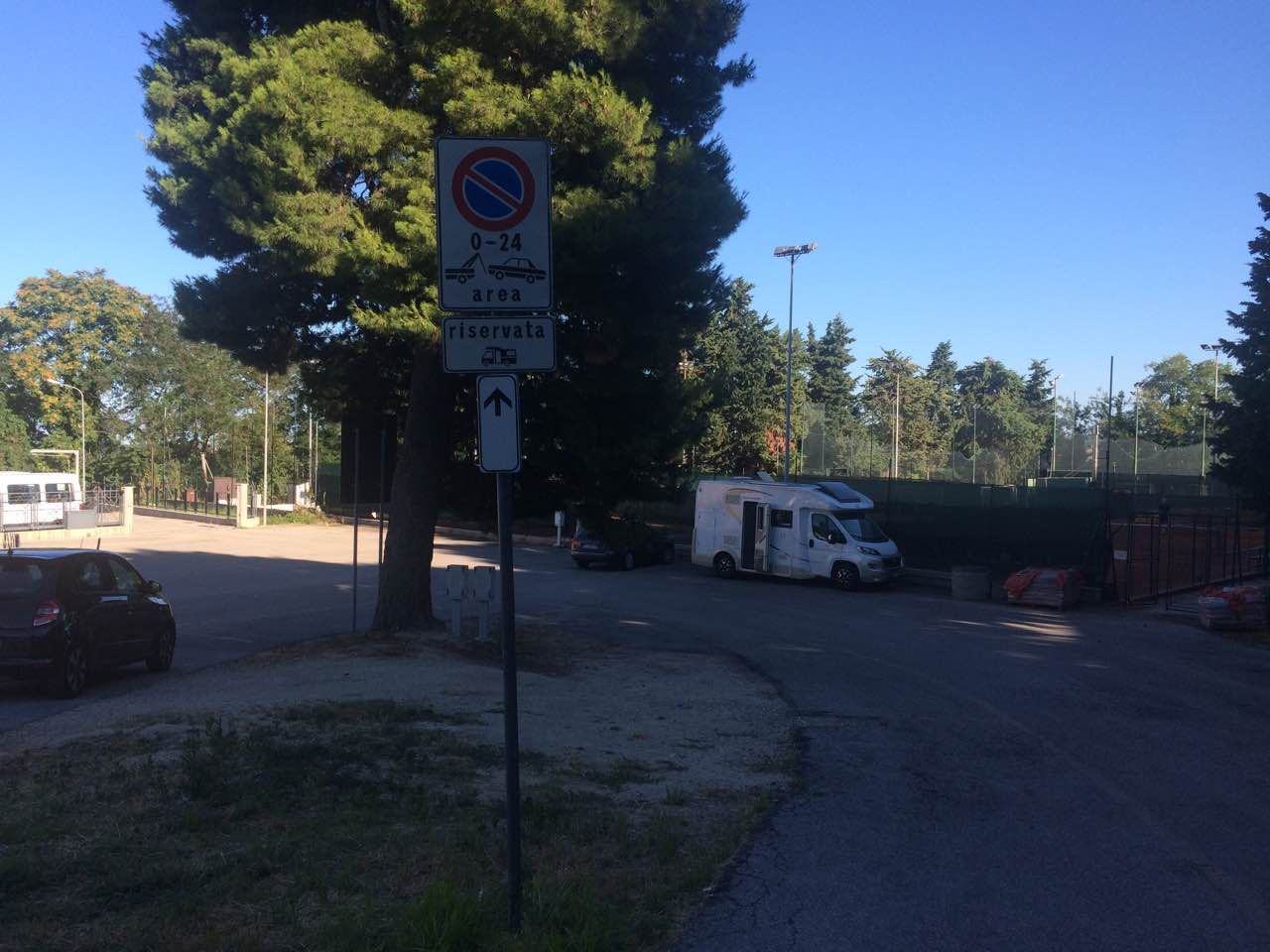 Punto sosta presso gli impianti sportivi e campi da tennis, davanti alla Croce Verde, 10 posti su asfalto con illuminazione, carico acqua, pozzetto. Sosta max 48 ore.