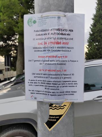Visitata a inizio dicembre 2022. Ottima area sosta, ora a pagamento con tariffa giornaliera: 5€ bassa stagione (dal 7/1 al giovedì prima di Pasqua; dal 1/10 al 6/12) e 7€ alta stagione (dal venerdì di Pasqua al 30/9; dal 7/12 al 6/1) pagabili all'addetto della Croce Verde. Massimo 48 ore di sosta consecutive. Il mercato del sabato mattina non impedisce la sosta (si svolge solo su una parte del piazzale adiacente).