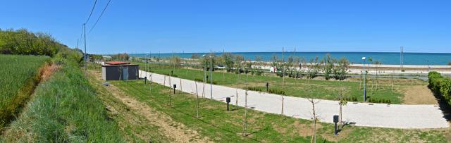 L'area in sé è carina, nuovissima (inaugurata un mese fa) e offre molti servizi. Fondo erboso e pianeggiante, personale cortese e attento. Le vicinissime ferrovia e statale danno meno fastidio di quanto si possa immaginare. La ciclabile passa accanto e permette di raggiungere facilmente Fano e Pesaro. Non ci è piaciuta la spiaggia: gli scogli sono sulla battigia e il mare non si vede. Anche il prezzo ci è sembrato un po' altino.